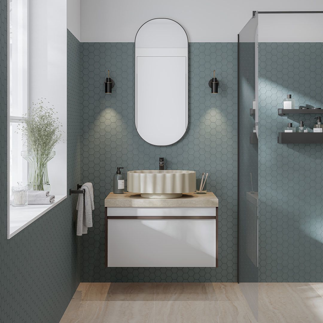 Выбирайте размер, форму и цвет раковины, размер тумбы Модула и рисунок столешницы из керамического гранита для создания одного из сотен возможных решений!