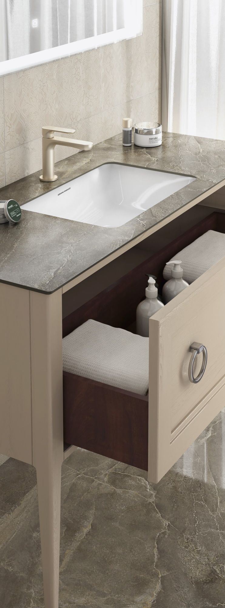 Серия Плаза Классик — это тумбы трёх размеров, выполненные в элегантных цветах, с возможностью монтажа накладных или встраиваемых раковин Плаза, керамические столешницы с эстетикой мрамора, высокий пенал с распашной дверцей, а также классические прямоугольные зеркала, рамы которых по цвету и фактуре соответствуют остальной мебели. Расположенная по периметру зеркал LED-подсветка управляется бесконтактным выключателем в нижней части зеркала.